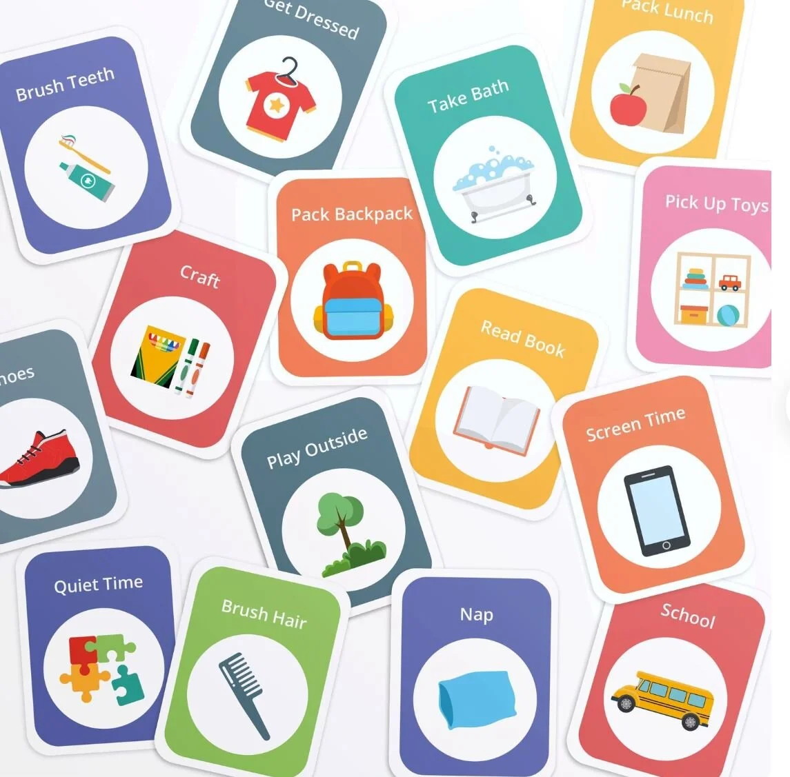1. A schedule is key. Toddlers do better when they know what to expect. This makes it easier to get them to do what you would like them to do, and helps them resist transitions from one activity to the next less. A picture schedule can be very helpful with toddlers (LOVE the cards I have pictured, which are by DaysWithDesign on Etsy, or you can simply Google pictures and print them out), and once they associate the pictures with an activity it gives you some freedom to change up the schedule when you need to. When using the picture schedule, both say what the activity is “time for ___ to play with his toys!” and show them or point to that picture right before you go to that activity, so they begin to understand what the picture is associated with. We’ve been using the term “working” with our toddler, and telling him we need to “do our job”. We have been telling him what his “job” is too (like cooking in his play kitchen).
